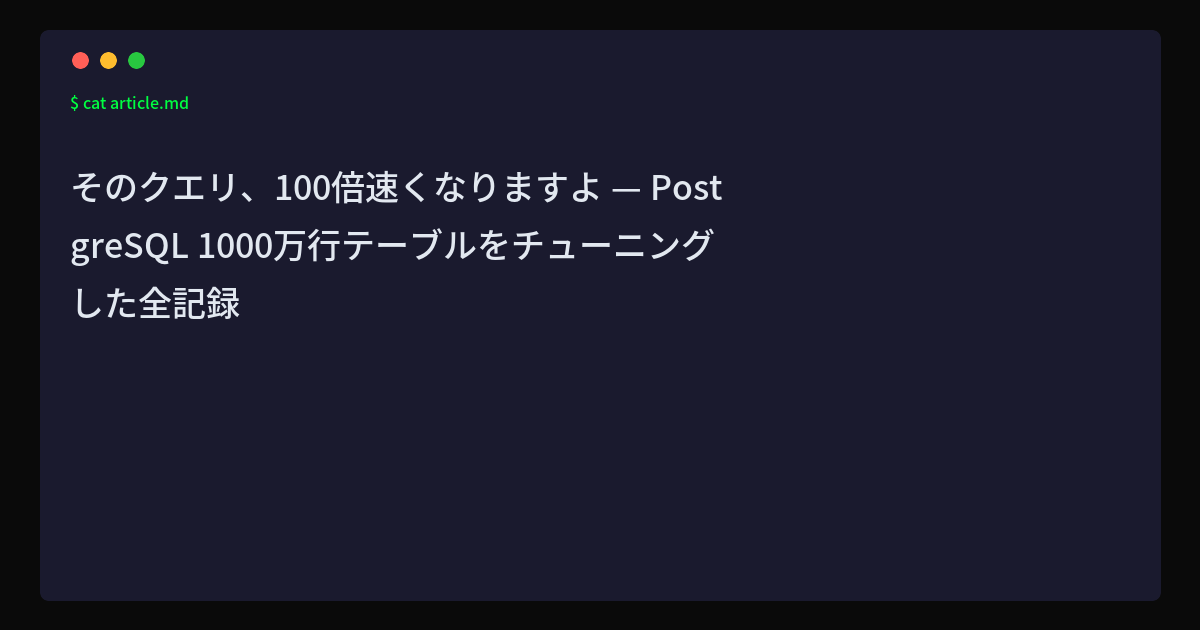 「SQLが遅い」という報告は、サービスが成長する過程で必ず直面する課題だ。特にテーブルの行数が数百万行を超えたあたりから、今まで問題なかったクエリが突然遅くなることがある。この記事では、1000万行のordersテーブル...